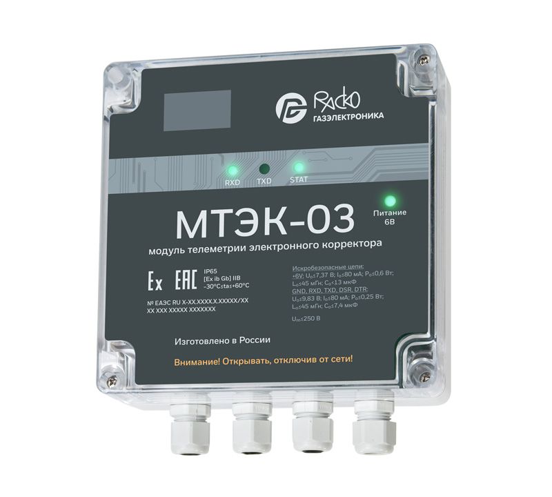 Модуль МТЭК-02 предназначен для организации канала связи с корректорами ЕК260, ЕК270, ЕК280, ЕК290 по интерфейсу RS-232/RS-485, а также, опционально, по каналам WiFi, Bluetooth, CSD, GPRS. Модуль телеметрии МТЭК-02 имеет в своем составе барьер искрозащиты, а также может обеспечивать связь с установленными во взрывоопасной зоне корректорами.